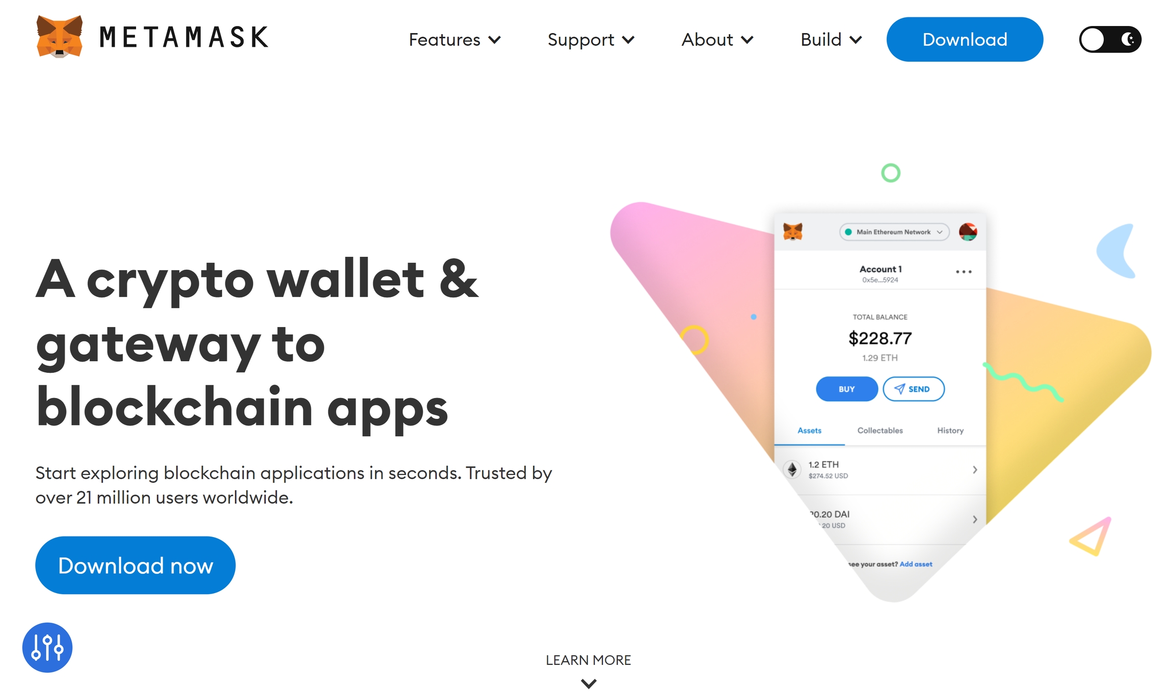 Available as a browser extension and as a mobile app, MetaMask equips you with a key vault, secure login, token wallet, and token exchangeβeverything you need to manage your digital assets.